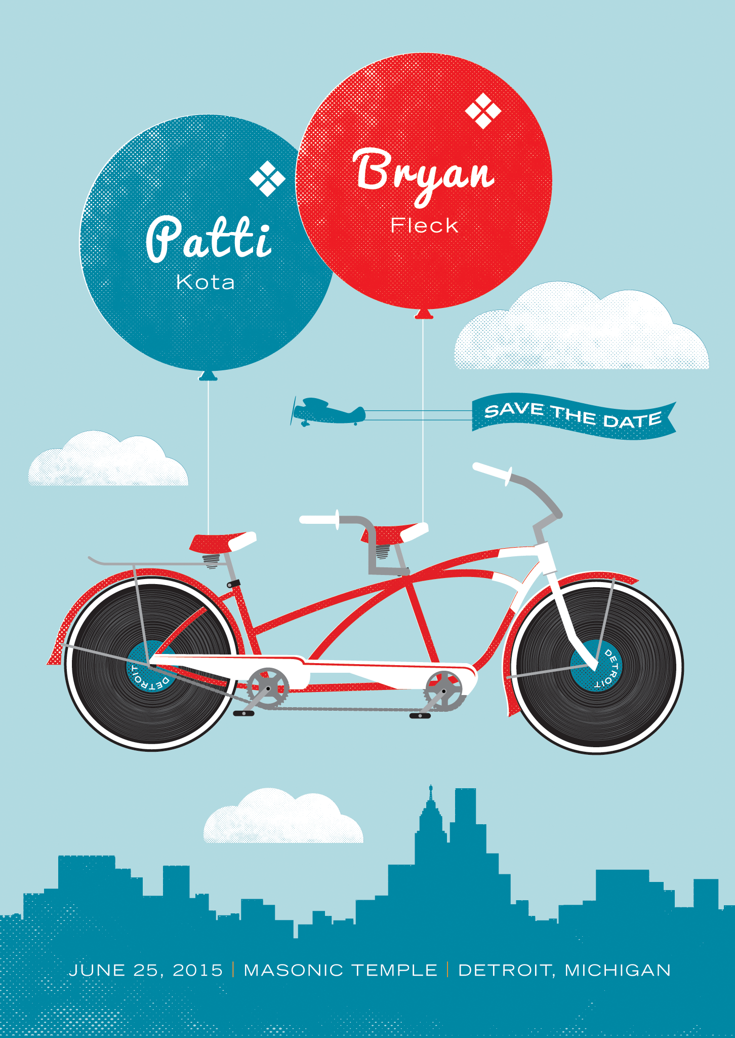 Not so much a poster but could be. These were Save the Date postcard concepts. The couple loved Detroit, music, biking, collecting vinyl and wanted the design to reflect their passions. They chose the tandem bicycle version.